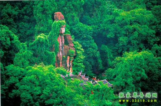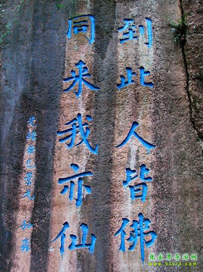 不二門內(nèi)由石灰?guī)r風(fēng)化形成的一尊巨大石佛,聳立于萬綠叢中,高六丈,青冠白面,頭頂白云,腳踏碧水,人們以其形神稱為“觀音巖”。《永順縣志》稱“觀音巖素有‘湘景名峰第一巖’之稱”。觀音巖下,聳立著一組瑰麗多姿、古色古香的殿閣建筑群,這就是“嵩山堂”,包括三觀殿、玉皇閣和禪房客舍,工藝精巧,玲瓏別致。特別是正殿后的地藏庵,與老司城明代建筑祖師殿結(jié)構(gòu)相似,背倚石壁,右通八陣圖,左達(dá)熱水坑,周圍怪石森列,古木參天。觀音巖北部山上是天造地設(shè)的“八陣圖”,有的如排戟,有的似春筍;有的像古佛,有的若走獸。八陣圖之奇,不僅在于它林立的怪石,最主要的是在于由龜裂紋石板鋪成的時上時下時隱時現(xiàn)的彎彎小徑——或穿過地下幽深的石洞,或延展于密林雜草叢中,或環(huán)繞于奇峰怪石之間,使八陣圖的東、南、西、北四門相通,復(fù)雜繁多的石徑互相連接形成網(wǎng)絡(luò),人們有時難以找到出路。也許,這就是八陣圖命名的緣由。不二門內(nèi)兩側(cè)石壁開闊如屏,歷代文人墨客或贊山水之幽絕,或抒心胸之豪情,雕鑿了種種摩崖石刻。據(jù)《永順縣志》記載,不二門石刻有神秀獨鐘、吾道南來、白云門開、砥柱中流、眼前南海、百寶勝光、別開生面、別有天地等100多處。歷經(jīng)風(fēng)雨滄桑之后,現(xiàn)僅存鬼斧神工、勝境無雙、滌盡塵氛、瞻奇仰異、海上飛來等數(shù)十處。清代名士白介庵所作《松徑留云》、《古洞仙蹤》、《層閣聳翠》、《玉嶂屏環(huán)》、《澄潭月影》等觀音巖八景詩尚凸現(xiàn)在石壁之上。其中《石門天鑿》一詩完整無缺:“法門高聳五云偎,鬼斧神工妙化裁。鞭石無痕還著相,振山有鐸不須錘。地沾花雨千歧坦,道接薪傳一線開。莫道終南稱捷徑,巨靈神辟小蓬萊。”清代庚辰年間的探花景元,曾在石壁上題刻“到此人皆佛,同來我亦仙”。他還以一筆揮成的“山青海岸”疊字如圖似的符合成一個“岸”字鑿刻在摩崖之上,堪稱罕世之作。石壁上近年來還鐫刻了偉人毛澤東的詩詞和儒將蕭克、畫家黃永玉等巨擘的題字,游人置身其間,飽享山水美景、名勝古跡與文化藝術(shù)的熏陶。