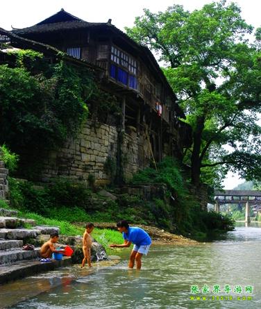 民宅多為吊腳木樓,依山傍水而建,臨河者倒影澄潭如水中街市,依山者雄峙高崖似空中樓閣。兩條河潔凈透亮,其中小河尤為美麗,青山夾岸,綠水長流,河畔蓼紅芷白,桂馥蘭芳,素有“香溪”之稱。其水盡來自溶洞,距街三里之內,就有魷魚洞、犀牛洞、王家洞、向家洞幾股洞泉和一個叫“雞屎潭”的溫泉。 “雞屎潭”來有濃重的硫磺味,水溫如沸,除污力極強,根本不需肥皂便能將汗?jié)n洗得干干凈凈,并能醫(yī)治瘡疥,維護皮膚健康。河中多魷魚,肉嫩且肥,立冬前盡逆水潛入溶洞起冬,立夏前兩三天則成群結隊隨夏汛而出,鄉(xiāng)人在洞口安上網壕,只需“守株待兔”,便能得到豐盛的收獲。在20世紀70年代以前,有時每天可得幾百斤。 小河灘多流急,是漂流的極佳去處。