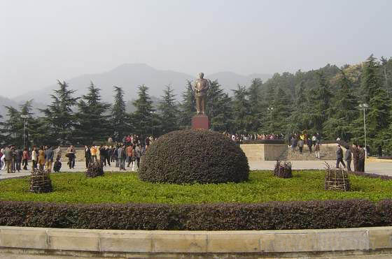 毛澤東銅像位于韶山沖的中心,紀念館、毛氏宗祠與韶山賓館之間。銅像區(qū)占地5200平方米,是經(jīng)中共中央批準(zhǔn)興建紀念毛澤東同志誕辰100周年的重點獻禮工程。這里原是一片沃野,地勢平坦開闊,周圍群山拱護。韶蜂在遠處,高峻挺拔,云富坨大山巍峨雄壯,十八羅漢山逶迤綿長,黑石寨鐵骨錚錚。在山的襯托下,銅像更顯得氣勢磅礴。