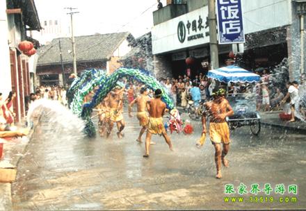 張家界潑水龍又叫“澆水龍”,于唐朝時期由移居本地的白族興起演變而成,在永定區(qū)的尹家溪鎮(zhèn)西尹村、莫家崗村十分盛行,是當(dāng)?shù)?a class="insidelink" href="http://m.syzsqy.com/fengqing/" title="土家族">土家族,白族、苗族在天熱干旱時節(jié)求雨祈福的一種形式。一旦出現(xiàn)旱災(zāi),當(dāng)?shù)仡^面人物就會出來組織潑水龍,演出極其隆重。