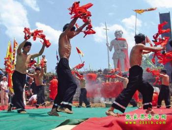 搖鈴隊伍圍圓圈有節(jié)拍的搖鈴。圓圈中另兩人面對面用肩共杠一根齊眉棍(木桿),左手叉腰,右手扶棍。從棍上搭一疋絲帕,一氣功師進來拿絲帕一頭,另一壯漢拿線帕另一頭。氣功師手拿絲帕慢慢下蹲,壯漢牢牢握緊絲帕。待氣功師翻天睡在地上后,其他人搬一床棉被蓋其肚部,再在上面放一塊木板,木板上放一副大石磨,石磨上架一套鐵犁、粑。氣功師睡在地上用右手打竹掛,口喊:"打個陰陽一只"!把竹掛打在地上,掛未成陰陽一只時,還要繼續(xù)打,直到打成,才把放在氣功師肚部的所有東西取下,氣功師雙手握緊絲帕慢慢起身站立。表演結(jié)束。