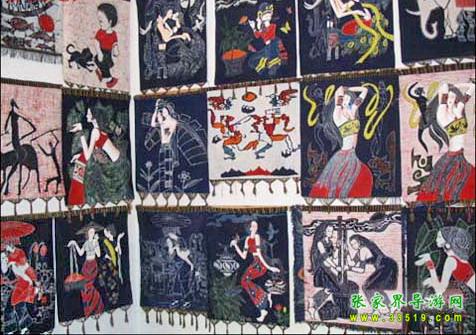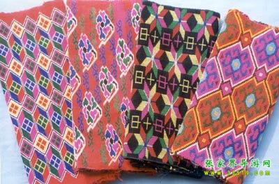 織錦。又名“西蘭卡普”、“土花鋪蓋”,為土家族傳統(tǒng)工藝品之一,是森林公園工藝品廠的主要產(chǎn)品??楀\是在特制的本質(zhì)織機(jī)上以錦紗為經(jīng)、五彩絲線為緯、手工提花織成。以其質(zhì)地厚實(shí)、堅(jiān)韌,色彩鮮艷,格調(diào)古樸,流暢生動著稱。圖案有花草、鳥獸、生產(chǎn)、生活、幾何、字樣等種類。為舊時土家姑娘必備嫁妝之一。據(jù)考證,早在漢代,土家織錦就作為方物貢入漢室宮廷。20世紀(jì)后,土家織錦曾漂洋過海至日、美、英等國展出,并作為禮品,被國家領(lǐng)導(dǎo)人贈送給外國元首及政府官員,如今織錦以壁掛、枕巾、沙發(fā)墊、桌圍、提袋、服飾等多種式樣遠(yuǎn)銷世界各地。
