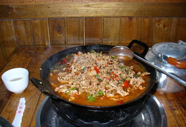 介紹: 血豆腐,就是將豆腐和豬血、豬肉及花椒、辣椒等佐料拌成泥狀,捋成卵形,以竹篩置火炕上,煙熏烤成臘黃,吃起來耐嚼味香,是土家特色菜,當(dāng)?shù)厝顺R云湎戮啤?在張家界的飯館里很難吃到正宗的土家特色菜,可以去做土味的特色餐館去解解饞。但是最正宗還是鄉(xiāng)下人家家里自己熏的,那才叫一個(gè)好吃!?。?/p>